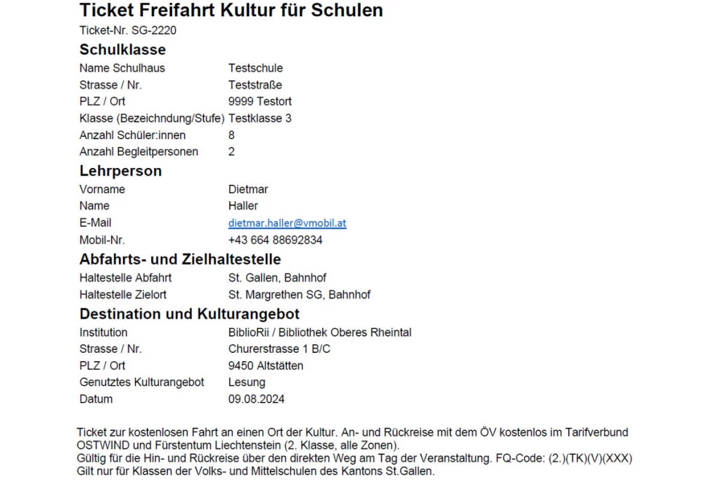 Das Schulkulturticket beinhaltet die An- und Abreise mit Gruppenreservation in Vorarlberg und Liechtenstein und bis zur Schweizer Grenzhaltestelle/Bahnhof für Ihre Reise in den Kanton St. Gallen, unabhängig davon, ob Sie direkt aus Vorarlberg in den Kanton St. Gallen einreisen, oder ob Sie aus Vorarlberg via Liechtenstein in den Kanton St. Gallen reisen.