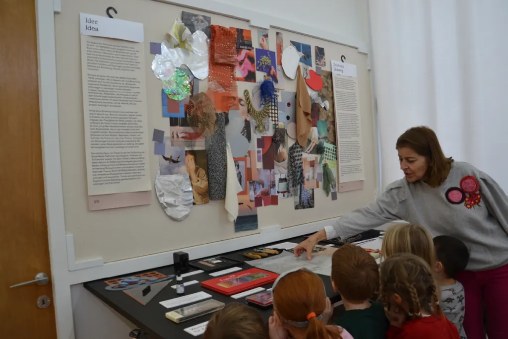 Beim ersten Termin besuchen sie das S-Mak. Dort erkunden die Kinder das Museum spielerisch mit allen Sinnen und treten mit Fäden, Musterstoffen, Kleidern in Berührung. Momentan stellt eine Künstlerin Namens LARISSA dort ihre Kunstwerke aus. Sie machen nach diesem Besuch Experimente mit Stickereien, fertigen die ersten Seiten ihres Leporellomusterbüchens an und gestalten als Gemeinschaftsarbeit eine Plastik an.