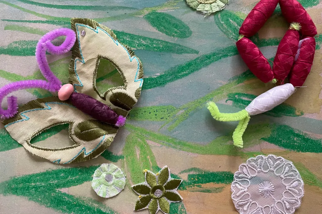Die Künstlerin wiederholt mit den Kindern die Details des Besuchs im S-MAK. Die Stickrahmen bleiben im Kindergarten und werden in den Gruppen zwischen den Projekttagen von einzelnen Kindern immer weitergestickt. Die jeweiligen Stationen besprechen sie gemeinsam und dann arbeiten alle Kinder im Wechsel. Beim nächsten Termin arbeiten alle an ihrem Leporello weiter, kleben Stickereiblüten in die grüne Box, basteln Bobinenobjekte und wickeln mit Garn Karton ein. Abschließend begegnen die Kinder nochmals den Stickereistoffen, verkleiden sich, wickeln Puppen und gestalten ein Gemeinschaftswerk aus Garnrollen und die Wiesenbox.