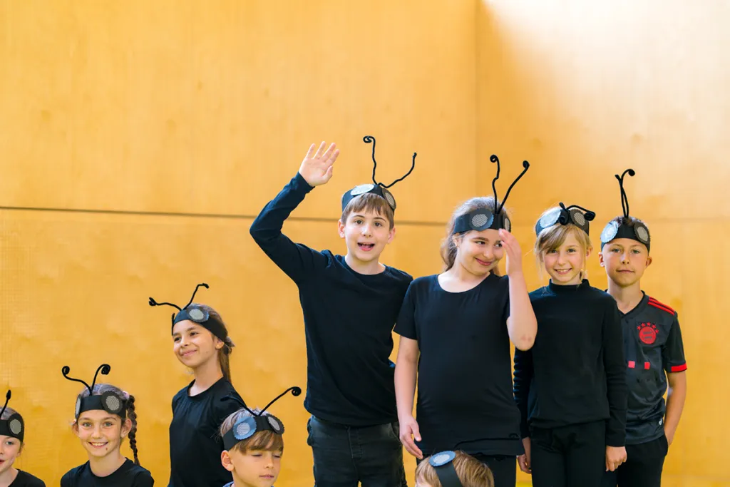 Im Anschluss beginnen die Tanzproben. Die Kinder zeigen freudige Begeisterung für die Bewegungssequenzen und setzen ihr Wissen aus dem Unterrichtsthema „Insekten“ in Bewegung um. Es entsteht ein beeindruckendes Bild, als sich über 40 Kinder gemeinsam tänzerisch bewegen.