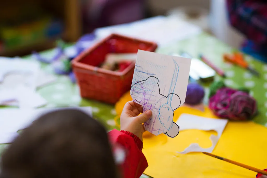 Die Künstlerin Christa Bohle leitet das Projekt. Gemeinsam mit den Kindergartenkindern gestaltet sie ein großes Buch. Dafür wird mit selbst angerührten Pigmentfarben und künstlerischen Techniken experimentiert. Mit Stickereien werden Frottagen gemacht, es wird großflächig gemalt, Abdrucke von Textilien werden angefertigt. Es entstehen gedruckten Papiere und Stoffe. Diese werden wiederum collagiert. Daraus arrangiert jede Gruppe ein grosses Ich-bin-ich aus Papier. Jedes Kind gestaltet ein kleines Ich-bin-ich. Pädagogische Einstiege, Körperübungen, Materialerfahrungen runden das Projekt ab. Christa Bohle begeistert die Kleinen über Wochen. Das fertig gestaltete Buch wird zum Abschluss präsentiert. Seite für Seite durchwandert das kleine Ich-bin-ich die Geschichte. Dieses wird in einem handlichen Format vervielfältigt. Somit kann jedes Kind sein Werk mit nach Hause nehmen.