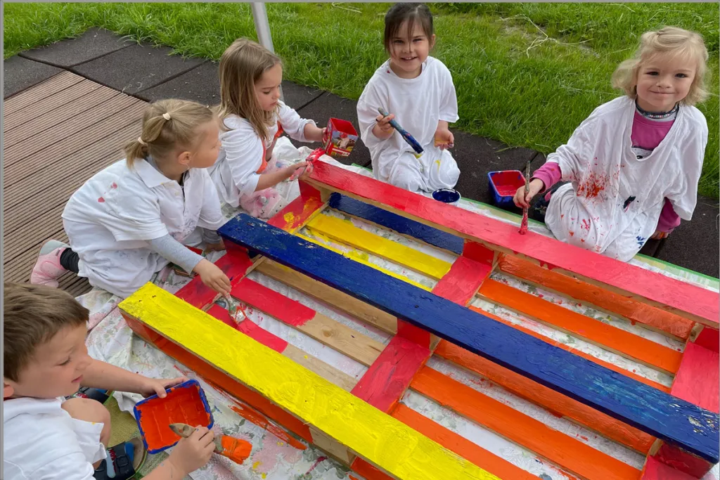 Beim dritten und vierten Termin bemalen die Kinder Paletten mit Dispersion- und Acrylfarben. Eifrig wird gemischt und neue Farben wie Rosa oder Grüntöne gemischt. Aus diesen Paletten wird mit der Künstlerin ein Hochbeet zusammengeschraubt und befüllt.Die Kinder dürfen sich selbst eine Zauberpflanze ziehen.