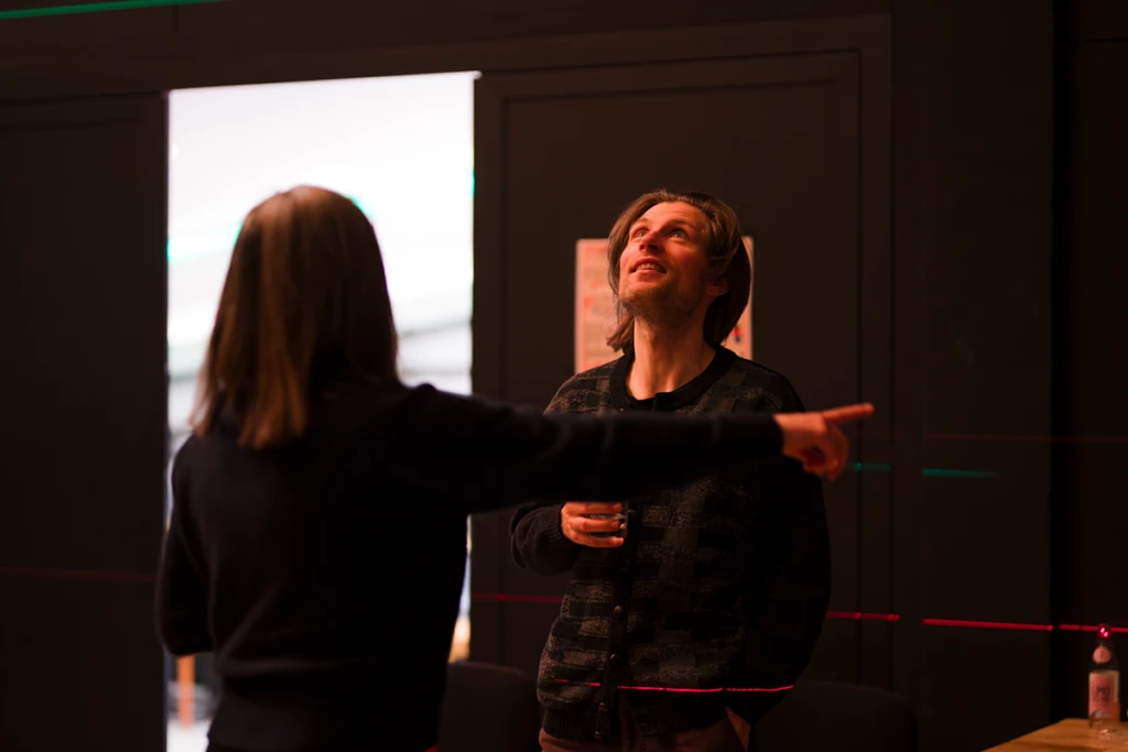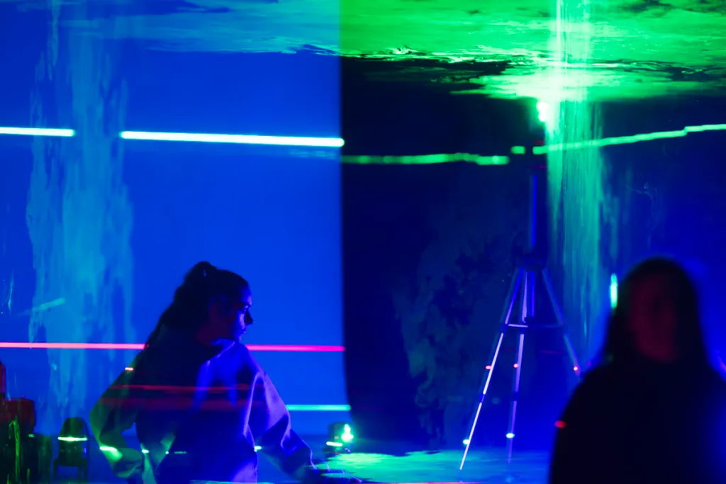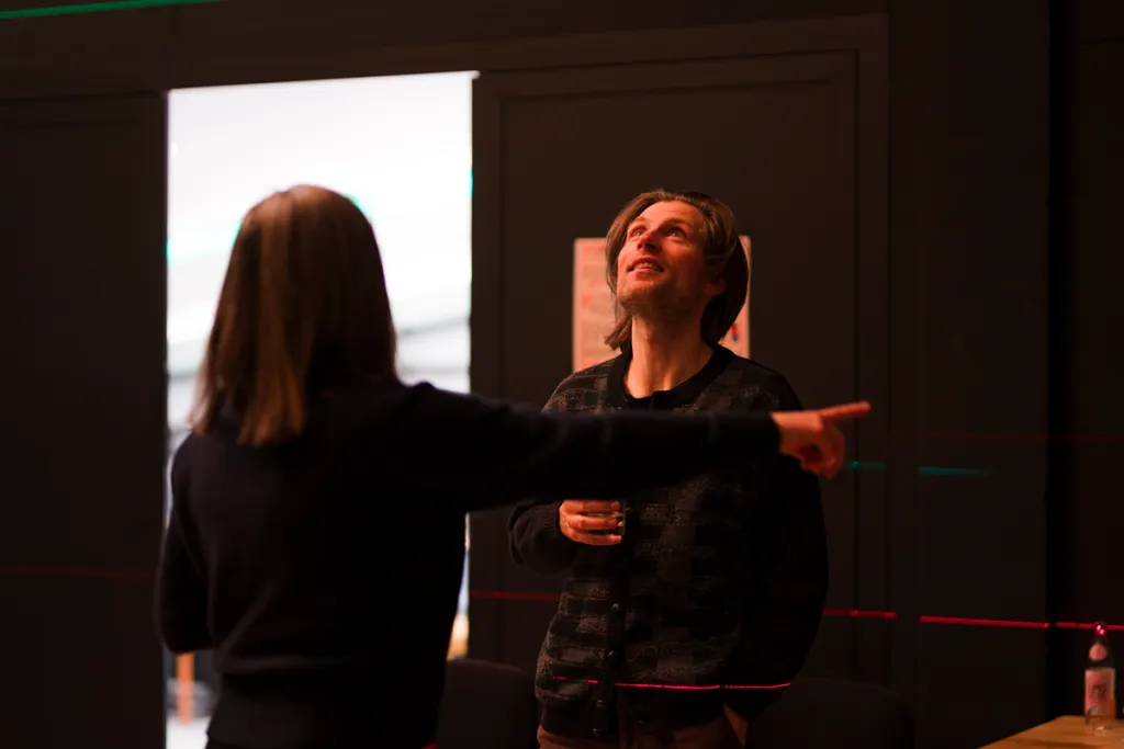 Anschließend kommen Laser-Messgeräte von SOLA zum Einsatz, die den Raum mit farbigem Licht durchfluten. Zu selbstgewählten Lieblingsliedern erleben die Lehrlinge eine eindrucksvolle Kombination aus Klang, Licht und künstlichem Nebel. So entstehen atmosphärische Räume, die Assoziationen zum Text und neue Perspektiven auf Wahrnehmung ermöglichen.