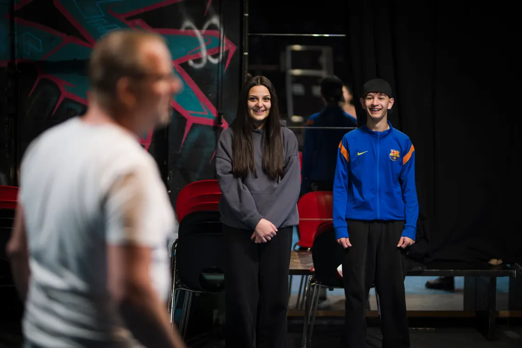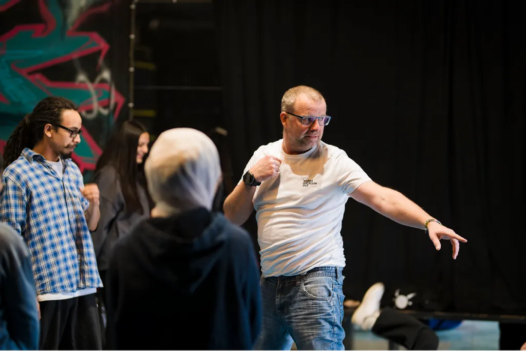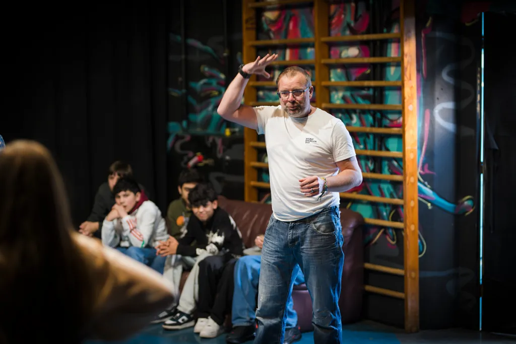 Ausgehend vom Thema „Vertrauen“ entwickeln Schüler:innen innerhalb einer Woche eine Szene, die in einer Katastrophe endet. Am Freitagabend wird sie erstmals einem Publikum präsentiert. Im Anschluss folgt eine zweite Aufführung – diesmal mit offener Struktur: Wer das Gefühl hat, dass sich die Situation in eine problematische Richtung entwickelt, kann „Stopp!“ rufen. Anschließend die Bühne betreten und den Verlauf verändern. Eine Rolle wird übernommen, der Moment neu gestaltet – mit der Freiheit, vor- oder zurückzuspulen.