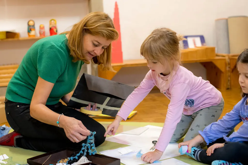 Beim letzten Termin werden Fotografien zum Arbeitsmaterial. Was können wir mit Fotos alles machen? Es wird mit Mikro versus Makro experimentiert. Die Kinder zeichnen sich selbst in einen Wald. Plötzlich sind sie klitzeklein und haben auf einer Blumenblüte Platz. Sie bekleben ihre eigenen Portraits mit Wolle, Stoffen, Folie. Als Überraschung hat Christa eine „Zauberkamera“ mitgebracht. Es wird mit der Instax Kamera fotografiert.