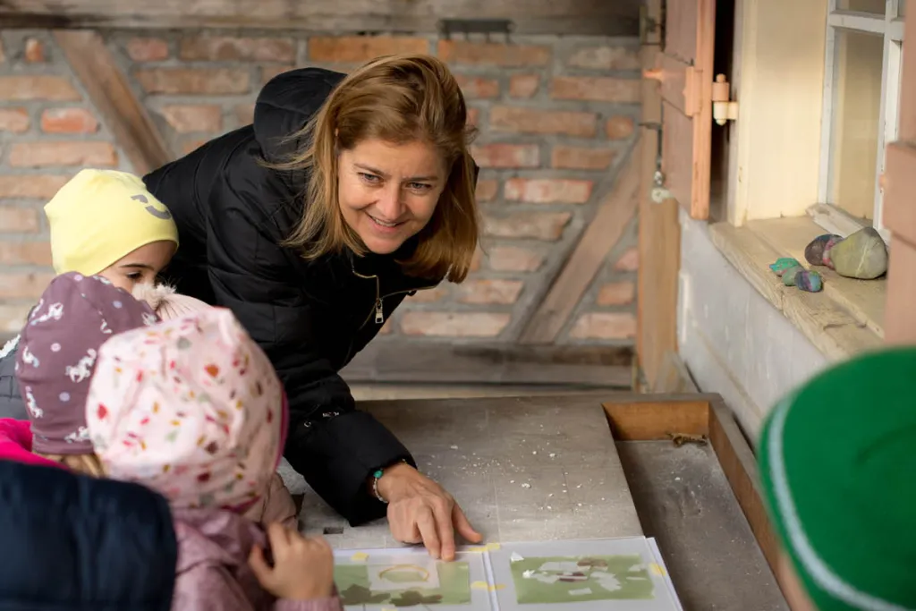 Beim dritten Termin werden die Kinder von der Fotografin Birgit Riedmann empfangen. In der Dunkelkammer machen sie gemeinsam Fotopapier. Kinder werden zu Modellen und zu Fotograf:innen. Sie schauen durch das Objektiv einer professionellen Kamera und drücken ab. Auf dem Display erscheint ihr Foto.