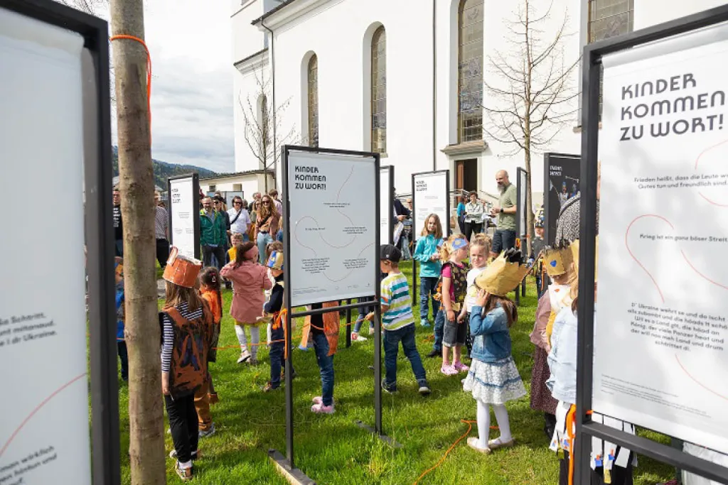 Auf der Eröffnungsfeier beim DENK.MAL in Hittisau waren viele der beteiligten Kinder mit ihren Eltern, Freunden und Verwandten anwesend, um stolz ihr Projekt zum Thema Frieden zu präsentieren und zu feiern.