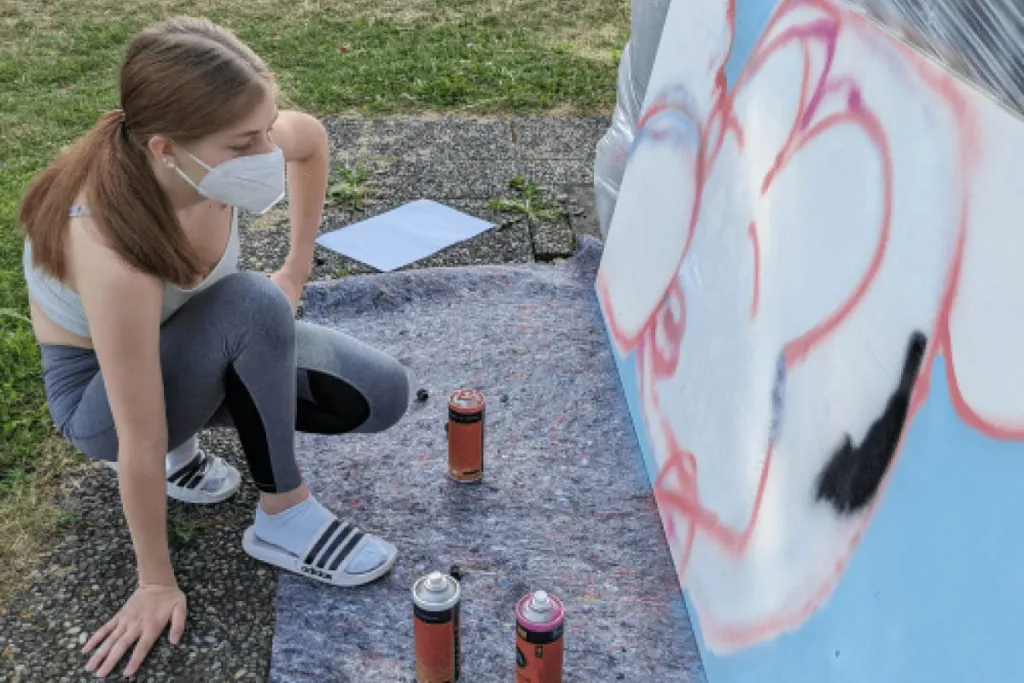 Dafür bietet sich für die Schüler:innen die Möglichkeit, bei einem zweitägigen Workshop mit dem Graffitikünstler Fabian Hämmerle, alias PEKS, in die Welt der Graffitis einzutauchen. Im ersten Teil des Workshops werden Ideen gesammelt und Entwürfe gezeichnet. Im zweiten Teil werden diese Entwürfe umgesetzt. Neben den Seitenflächen des Hochbeets stehen sieben Holzplatten in der Größe von 1,80m x 0,90m zur Verfügung. Diese werden im Innenraum des Schulgebäudes aufgehängt. Des Weiteren wünscht sich das Team der Social Networker ein Graffiti in der Größe von 1,20m x 0,60m für ihren Aufenthaltsraum.