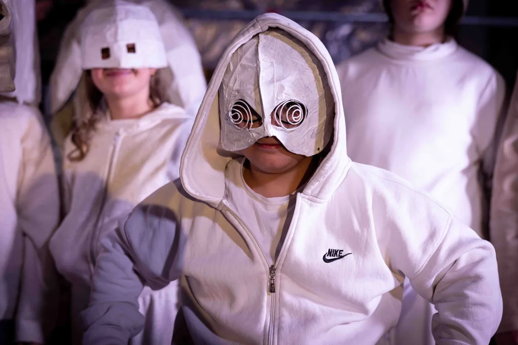 Die Schüler:innen von Lehrerin Sandra Fischer entdecken und erfinden in diesem Projekt gemeinsam mit dem Künstler eine eigene Sprache. Im Workshopformat entsteht ein neues Bewusstsein für Sprachgestaltung durch Körper, Masken, Vokale und Konsonanten.