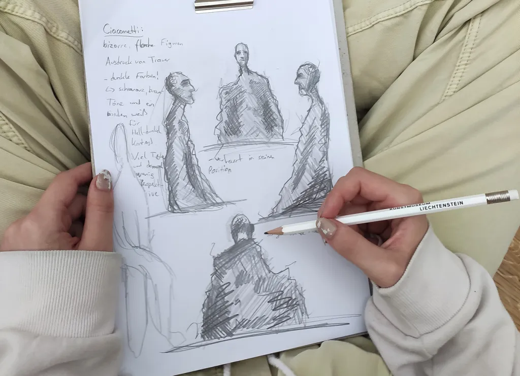 Wir erhielten eine Führung durch die Hilti Art-Foundation und bekamen Kunstwerke von namhaften Künstlern wie Picasso, Marcel Duchamp und Max Beckmann zu Gesicht. Die Museumspädagogin stellte interessanten Aufgaben. So versuchten die Schüler:innen mit Bleistift und Kohle einen Bronzeguss von Alberto Giacometti aus verschiedenen Positionen heraus zu erfassen und grafisch darzustellen. Diese Herausforderungen machten die Führung durch die Ausstellung noch spannender.