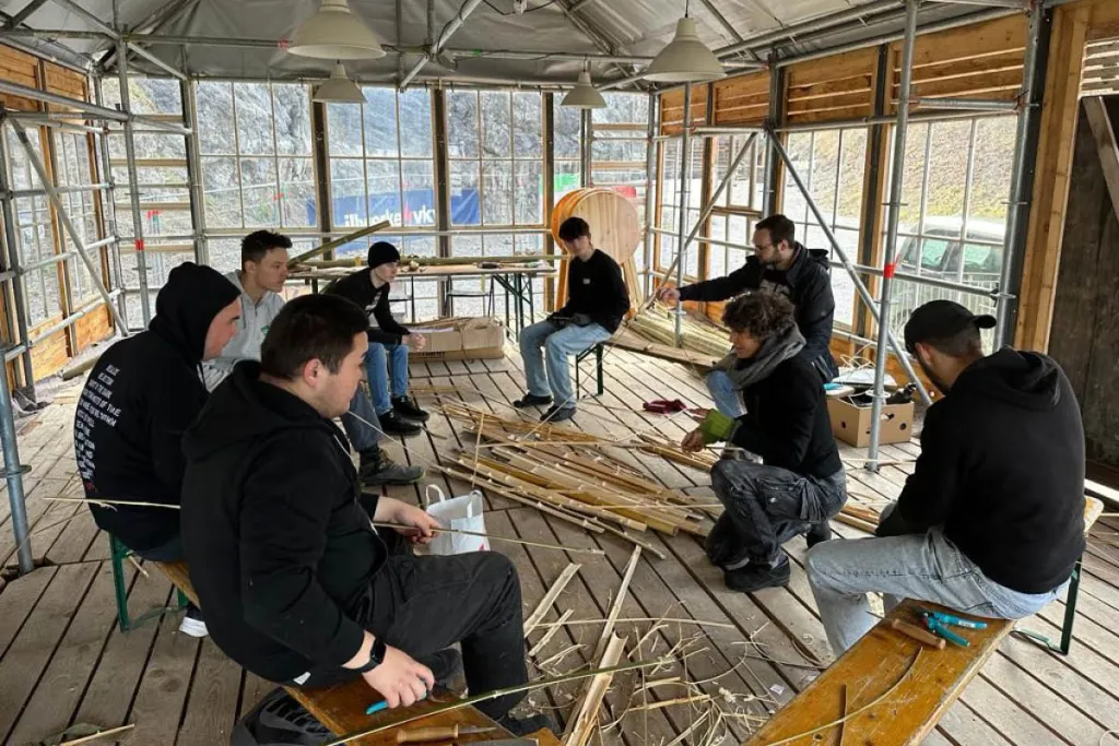 Lehrlinge aus der Region Walgau lernen den Steinbruch, den Kultursteg und das Material Bambus mit neuen Augen zu sehen. Aber nicht nur das - Anna Rubin vermittelt ihnen den Werkstoff Bambus genauso wie künstlerische Denkweise und handwerkliche Fertigkeiten. Dabei lernen sie intuitiv die Arbeitsweise der Künstlerin kennen. Sie lernen den Ort und das Material anhand ihrer Eigenschaften und Ästhetik einzuschätzen.