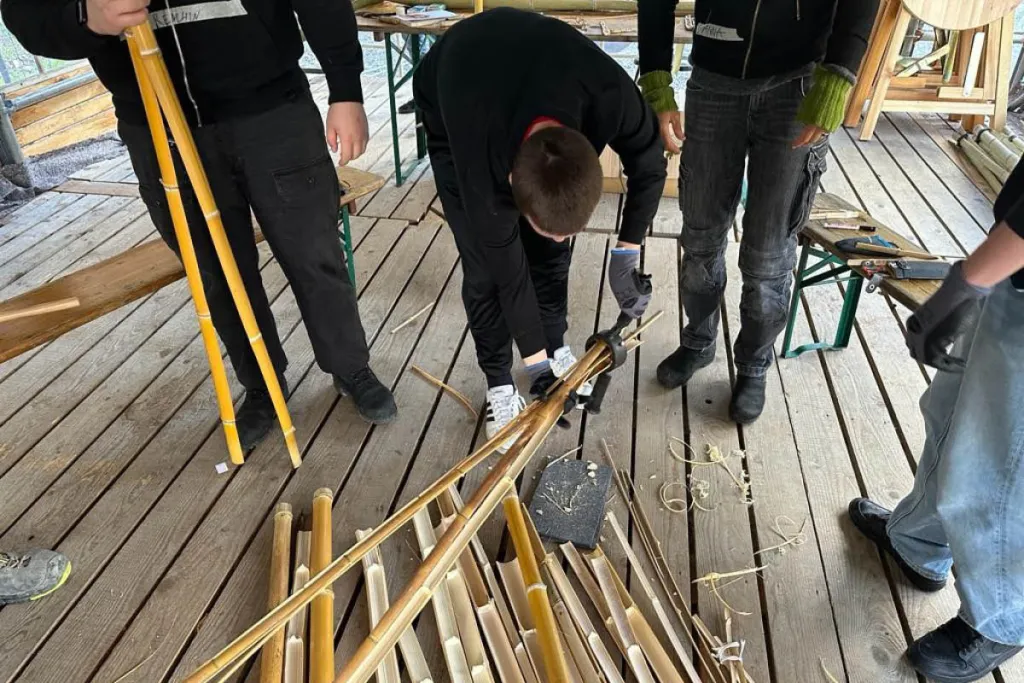 Was ist Bambus und warum Bambus? Wie ist die Materialsprache? Was sind die Eigenschaften? Wie die Beschaffenheit? Was bedeutet Nachhaltigkeit in der Kunst? Praktische Informationen über Anwendungsbereiche von Bambus - vom Zahnstocher bis zum Bau - sind ebenso Thema wie Landart. Vor Ort und für den Ort wird gemeinsam eine Kunstinstallation erstellt. Im Tun erlernen die Lehrlinge die Technik des Bambusspaltens und das Biegen von Bambusstäben durch Erhitzen. Sie fertigen Bambusknoten an und erstellen Module für die Installation.