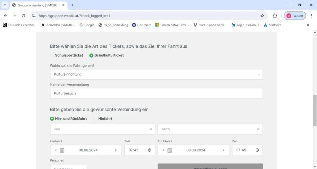 Bis zum Grenzbahnhof als Zielort ein, mit Datum und gewünschten Zeiten. Als Startort in der Schweiz muss die gleiche Grenzhaltestelle angegeben werden, die beim Schulkulturticket als Zielort eingegeben wurde.