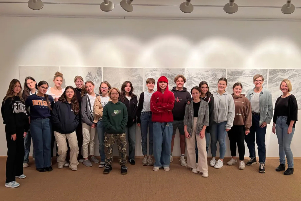 Am Eingang erklärte die ehemalige BORG-Schülerin Melanie Greußing, die ein Bachelor- und Masterstudium für Textil/Kunst & Design an der Kunstuniversität Linz abgeschlossen hat, uns, wie sie zu ihrem Beruf als Künstlerin und Ausstellungs-Kuratorin gekommen ist. Danach durften wir zunächst zahlreiche Abbildungen der Kanisfluh bestaunen. Von weitem sahen diese wie normale Bilder aus, doch je näher man kam, desto mehr konnte man erkennen, dass alle Bilder nur aus kleinen Punkten und Strichen in verschiedenen Grautönen bestanden.