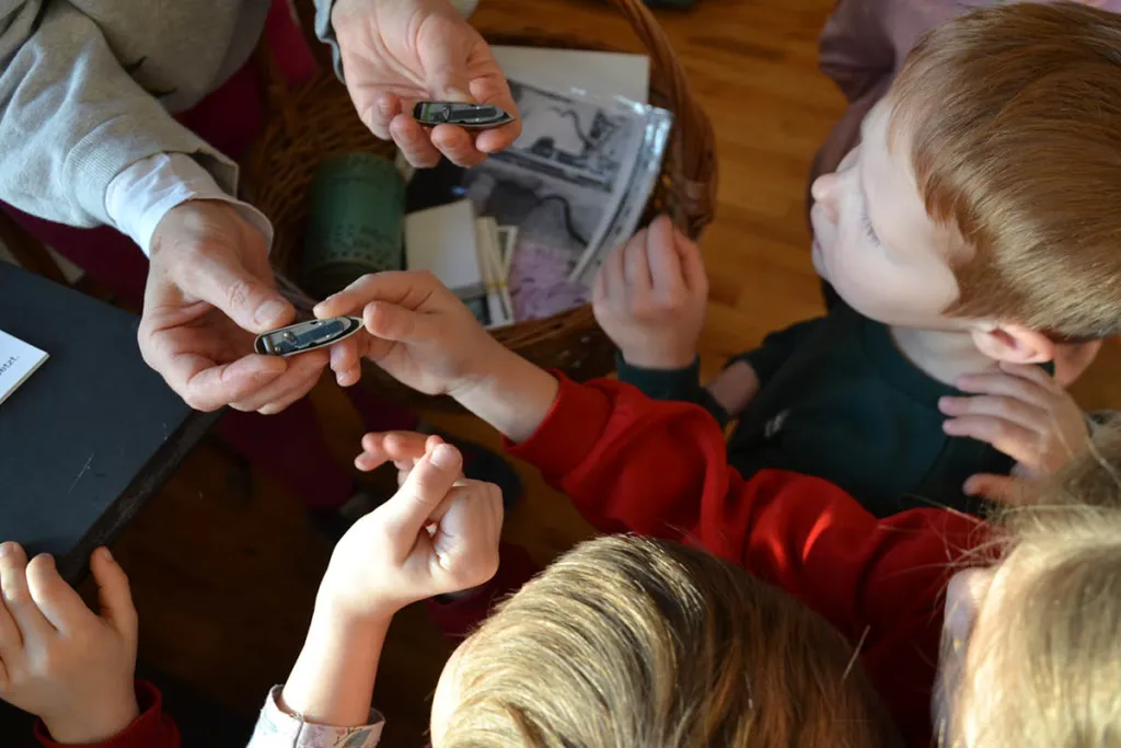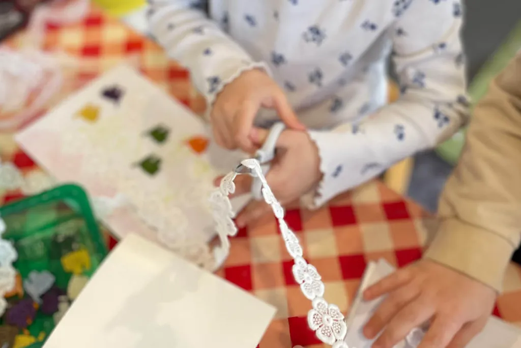 Die Künstlerin wiederholt mit den Kindern die Details des Besuchs im S-MAK. Die Stickrahmen bleiben im Kindergarten und werden in den Gruppen zwischen den Projekttagen von einzelnen Kindern immer weitergestickt. Die jeweiligen Stationen besprechen sie gemeinsam und dann arbeiten alle Kinder im Wechsel. Beim nächsten Termin arbeiten alle an ihrem Leporello weiter, kleben Stickereiblüten in die grüne Box, basteln Bobinenobjekte und wickeln mit Garn Karton ein. Abschließend begegnen die Kinder nochmals den Stickereistoffen, verkleiden sich, wickeln Puppen und gestalten ein Gemeinschaftswerk aus Garnrollen und die Wiesenbox.
