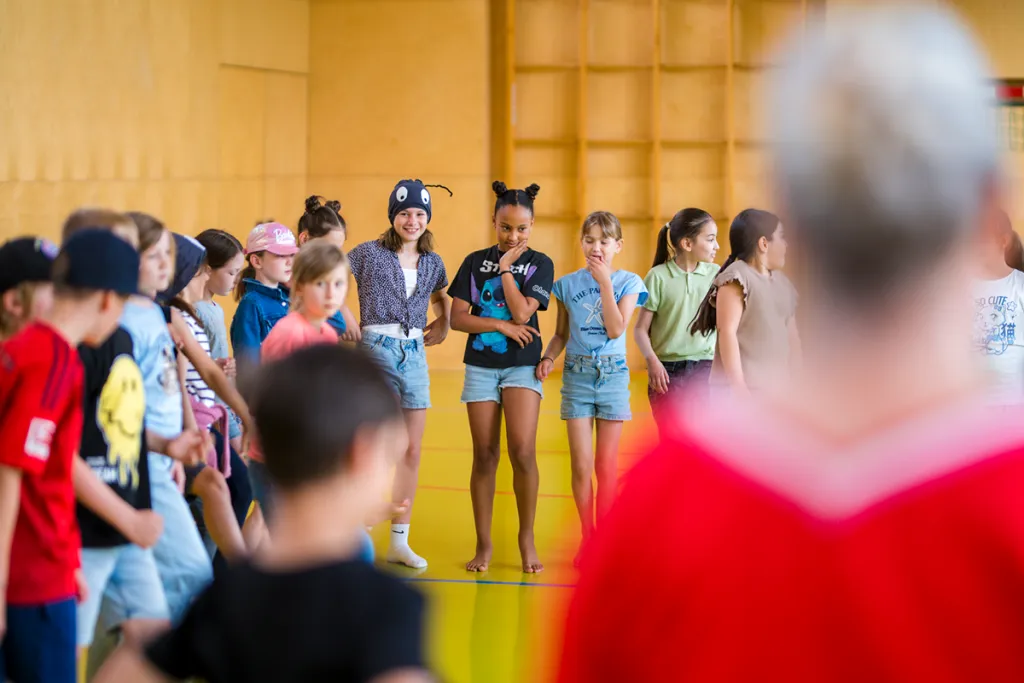 Im Anschluss beginnen die Tanzproben. Die Kinder zeigen freudige Begeisterung für die Bewegungssequenzen und setzen ihr Wissen aus dem Unterrichtsthema „Insekten“ in Bewegung um. Es entsteht ein beeindruckendes Bild, als sich über 40 Kinder gemeinsam tänzerisch bewegen.