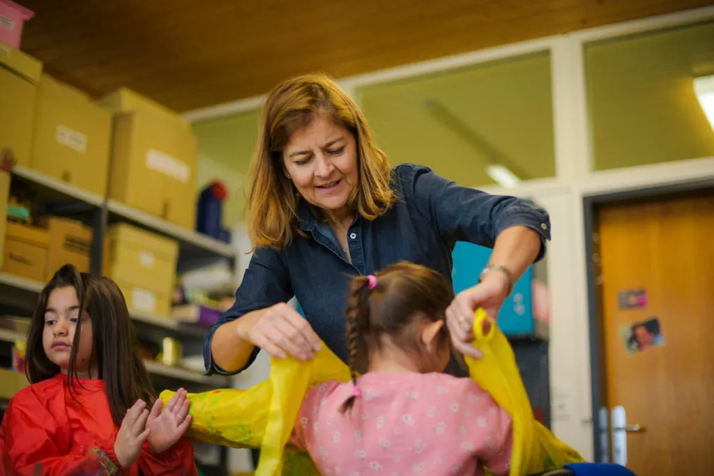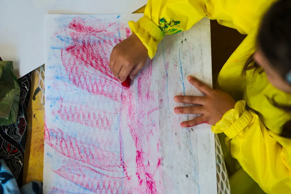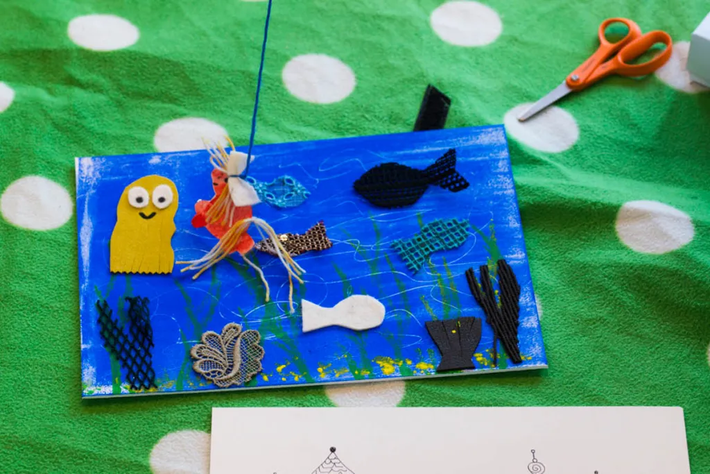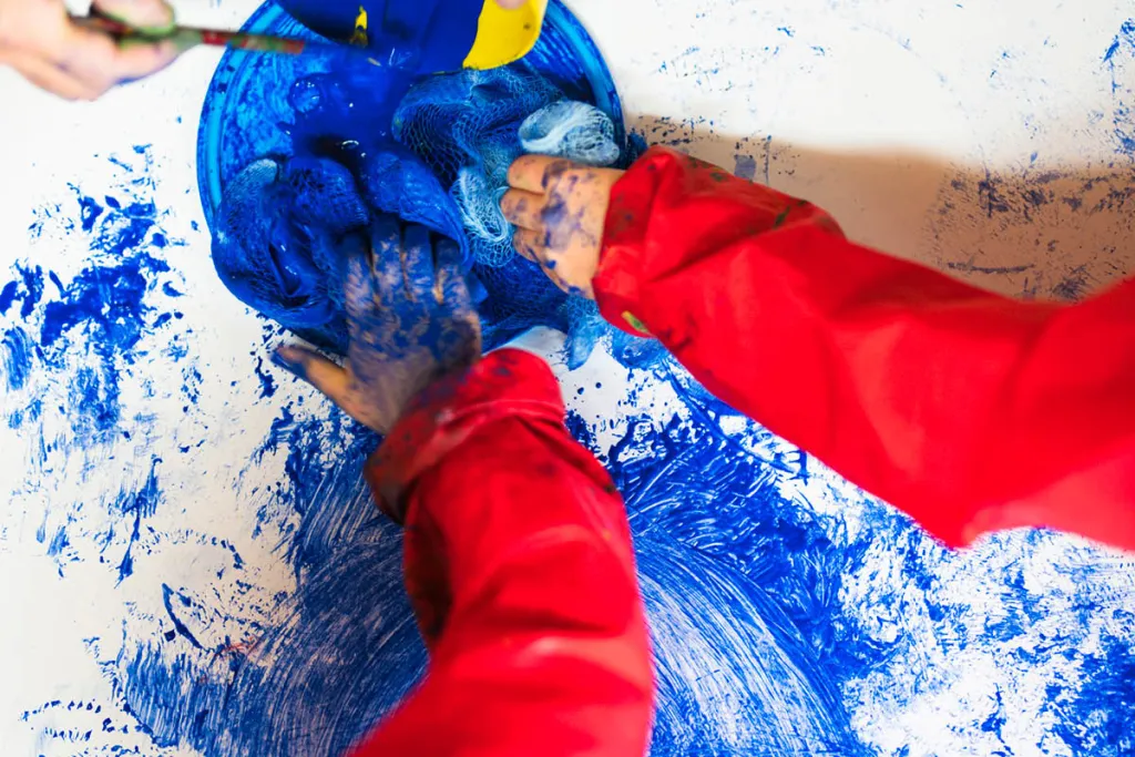 Die Künstlerin Christa Bohle leitet das Projekt. Gemeinsam mit den Kindergartenkindern gestaltet sie ein großes Buch. Dafür wird mit selbst angerührten Pigmentfarben und künstlerischen Techniken experimentiert. Mit Stickereien werden Frottagen gemacht, es wird großflächig gemalt, Abdrucke von Textilien werden angefertigt. Es entstehen gedruckten Papiere und Stoffe. Diese werden wiederum collagiert. Daraus arrangiert jede Gruppe ein grosses Ich-bin-ich aus Papier. Jedes Kind gestaltet ein kleines Ich-bin-ich. Pädagogische Einstiege, Körperübungen, Materialerfahrungen runden das Projekt ab. Christa Bohle begeistert die Kleinen über Wochen. Das fertig gestaltete Buch wird zum Abschluss präsentiert. Seite für Seite durchwandert das kleine Ich-bin-ich die Geschichte. Dieses wird in einem handlichen Format vervielfältigt. Somit kann jedes Kind sein Werk mit nach Hause nehmen.