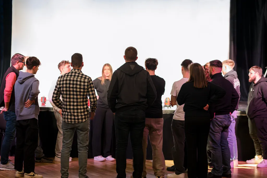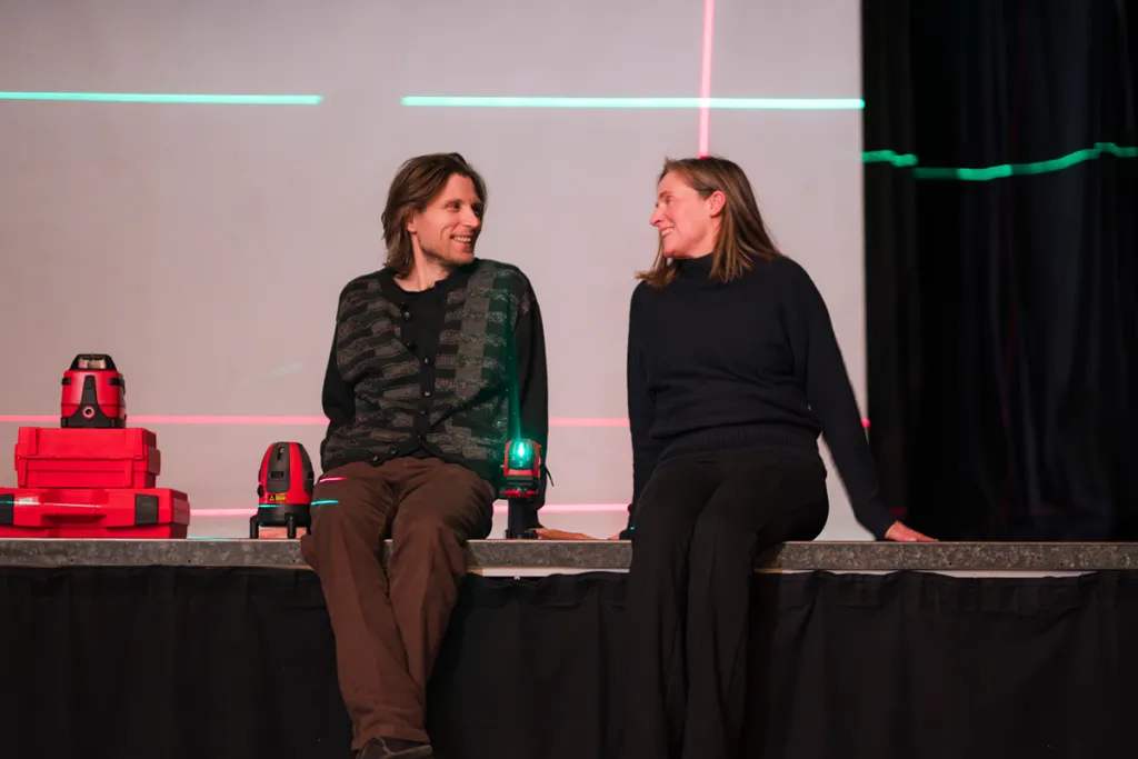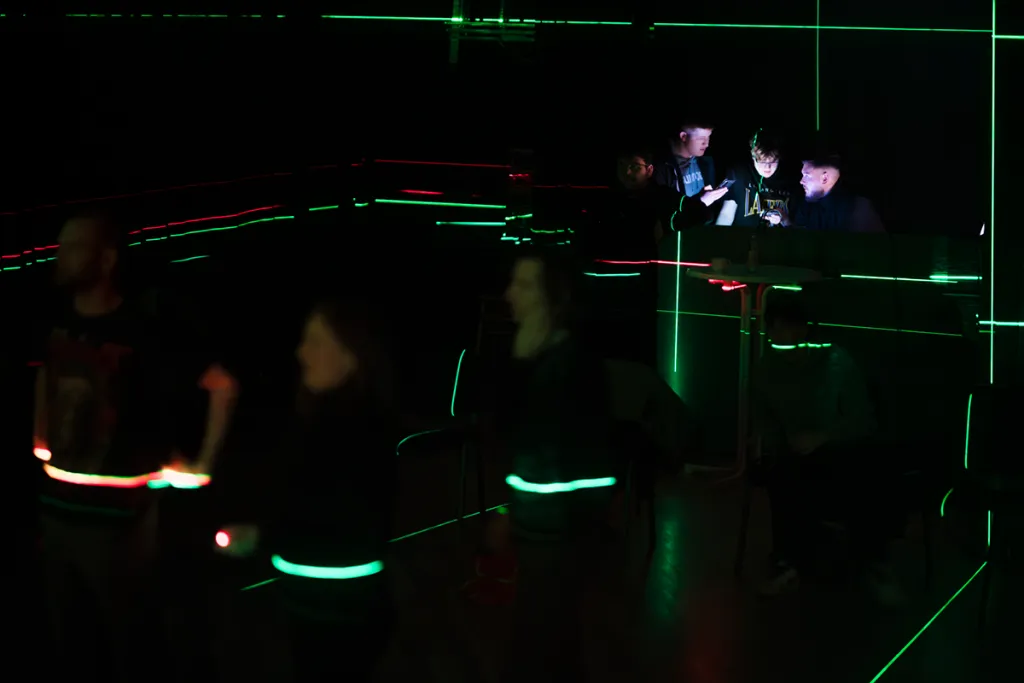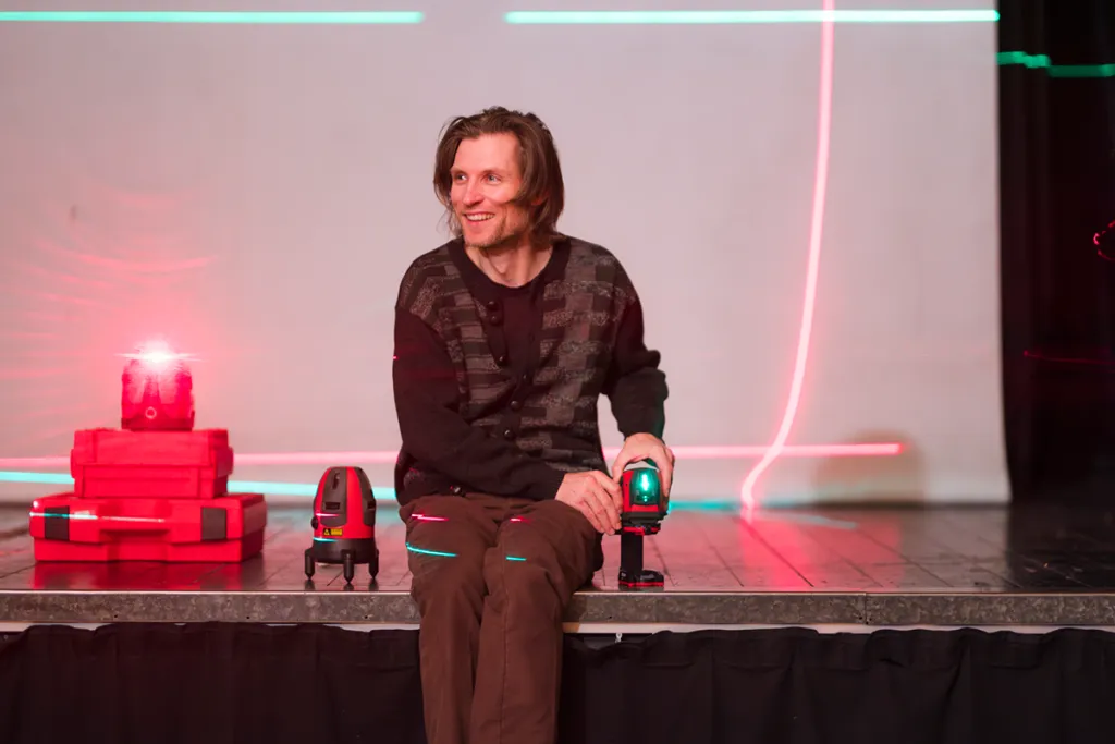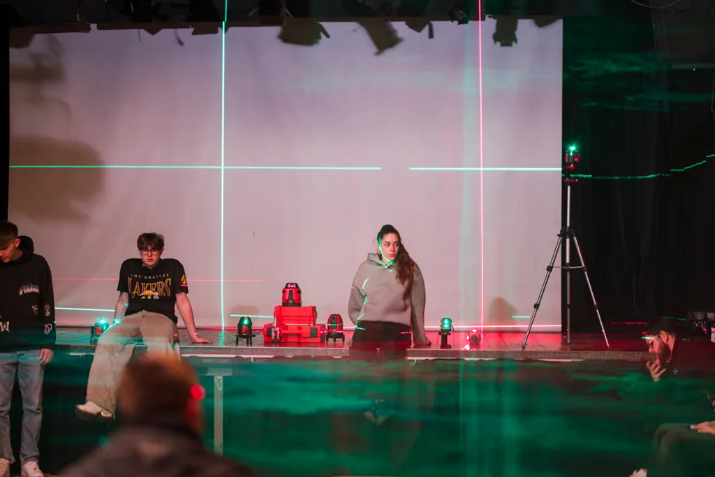 Anschließend kommen Laser-Messgeräte von SOLA zum Einsatz, die den Raum mit farbigem Licht durchfluten. Zu selbstgewählten Lieblingsliedern erleben die Lehrlinge eine eindrucksvolle Kombination aus Klang, Licht und künstlichem Nebel. So entstehen atmosphärische Räume, die Assoziationen zum Text und neue Perspektiven auf Wahrnehmung ermöglichen.
