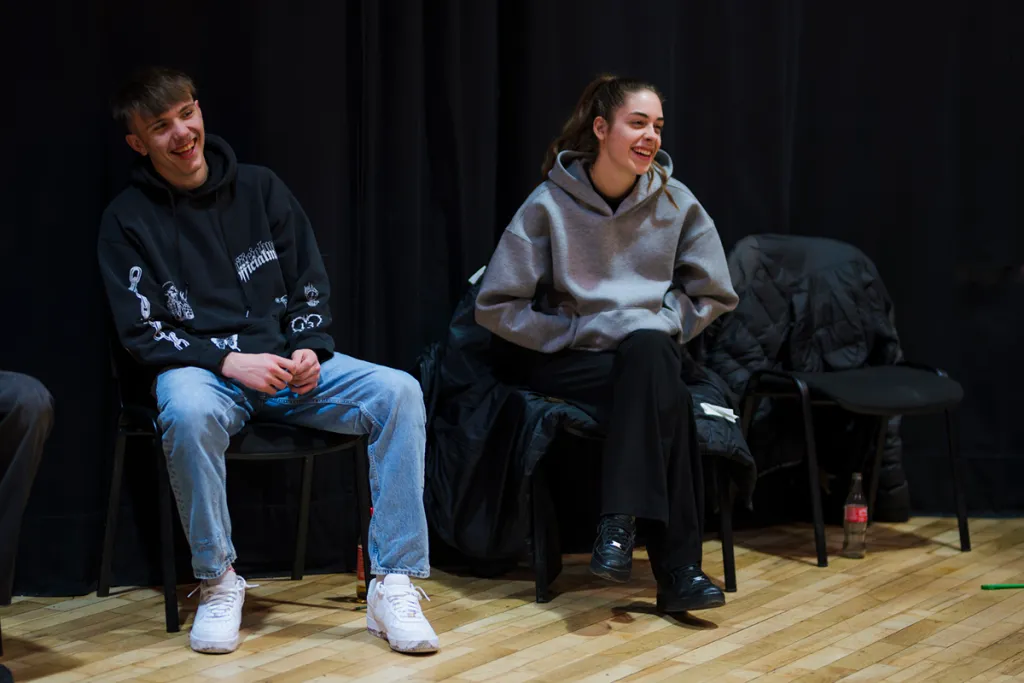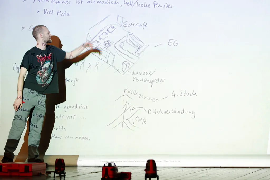 Die Lehrlinge der beiden Betriebe zeigen große Offenheit beim Projektteil „Wahrnehmung und räumliches Erleben“ unter der Leitung von Sigrun Appelt teil. Nach einer kurzen Lesung aus „Moderato cantabile“ von Marguerite Duras, vorgetragen von Kulturvermittler Andreas Jähnert, setzen sich die Teilnehmer:innen kreativ mit dem Text auseinander und präsentieren ihre Gedanken auf der Bühne.