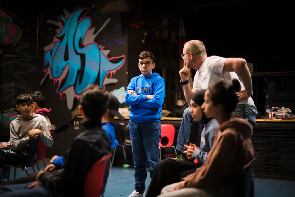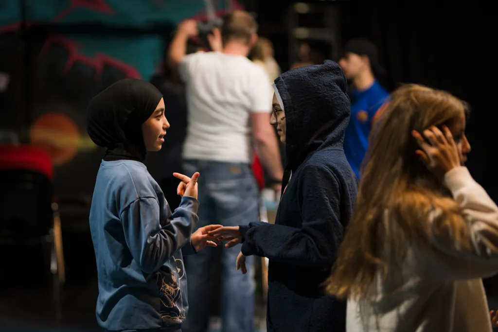 Ausgehend vom Thema „Vertrauen“ entwickeln Schüler:innen innerhalb einer Woche eine Szene, die in einer Katastrophe endet. Am Freitagabend wird sie erstmals einem Publikum präsentiert. Im Anschluss folgt eine zweite Aufführung – diesmal mit offener Struktur: Wer das Gefühl hat, dass sich die Situation in eine problematische Richtung entwickelt, kann „Stopp!“ rufen. Anschließend die Bühne betreten und den Verlauf verändern. Eine Rolle wird übernommen, der Moment neu gestaltet – mit der Freiheit, vor- oder zurückzuspulen.