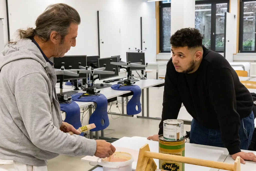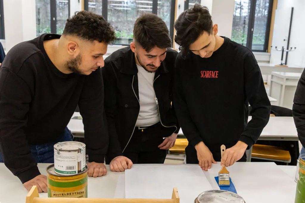 Dabei konnten die Jugendlichen selber Hand anlegen. Mit Hilfe der Spezialisten Heinz und Florian stellten sie Öl- und Kalkfarben her und versuchten sich in deren Anwendung. Schritt für Schritt wurden die Lehrlinge so an das Thema herangeführt. Wie aus gelöschtem Kalk und der Zugabe von Wasser Hitze entsteht, brachte alle zum Staunen.