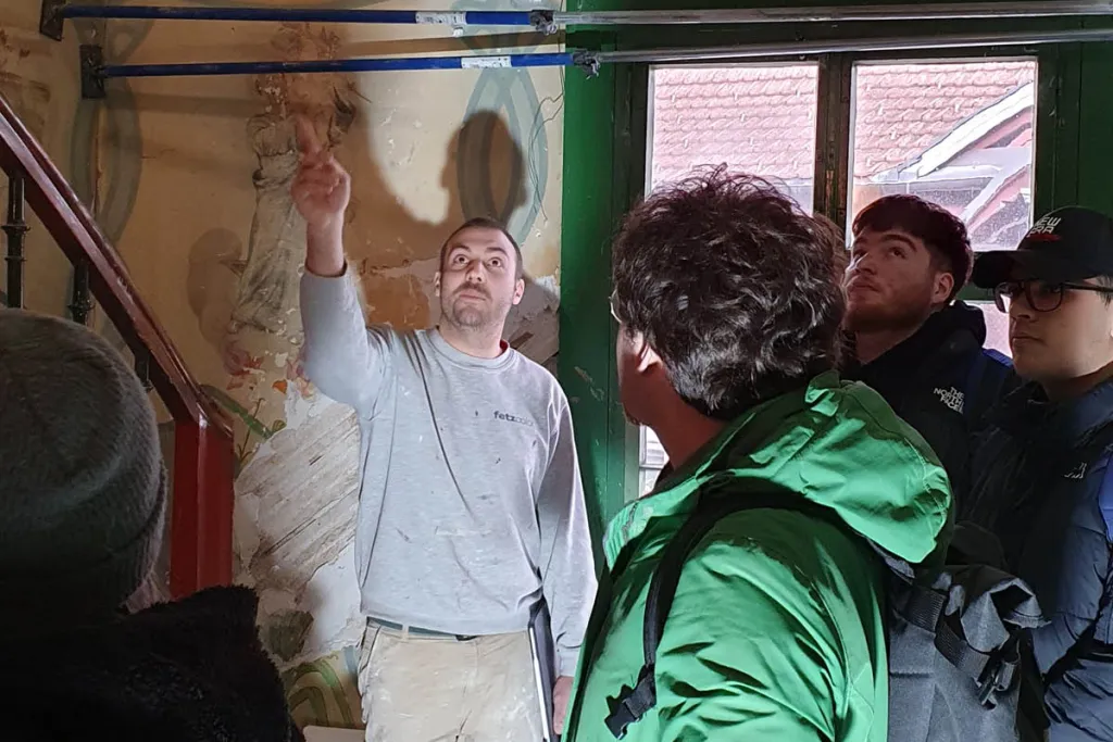 Im Anschluss an diese theoretische und praktische Einheit machten wir uns gemeinsam mit Frau Barbara Keiler vom Bundesdenkmalamt auf den Weg zu einer Exkursion. Beim Kalb Haus wartete auf uns Christian Giongo, der an seiner Praxisprüfung für seinen Master als Restaurateur arbeitet. Er restauriert dort die denkmalgeschützten Decken- und Wandmalereien. Bei einem abschließenden Rundgang durch die Stadt erfuhren die Lehrlinge noch einiges über die Häuser, deren Geschichte und Bausubstanzen.