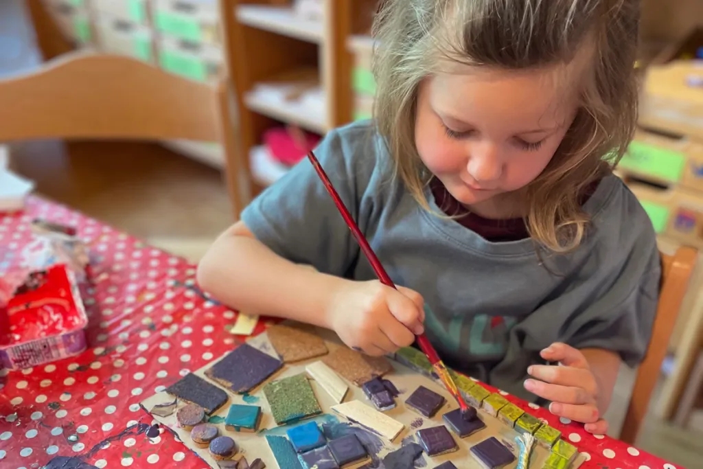 Zuerst lernt die Gruppe Matisse kennen und erfährt seine Lebensgeschichte. Ziel des Projekts ist es, in einer besonderen Farbe eine Box anzumalen. Sie dürfen mit Punkten ein impressionistisches Bild malen und aus Salzteig Figuren und Gesichter formen. Diese werden im Backofen gebacken. Die trockenen Figuren werden sorgfältig von Hand koloriert. Den Innenraum der Box bemalen sie mit Tubenfarben. Mit Buntpapier und Klebefolien gestalten die Kinder eine Kunstmappe.