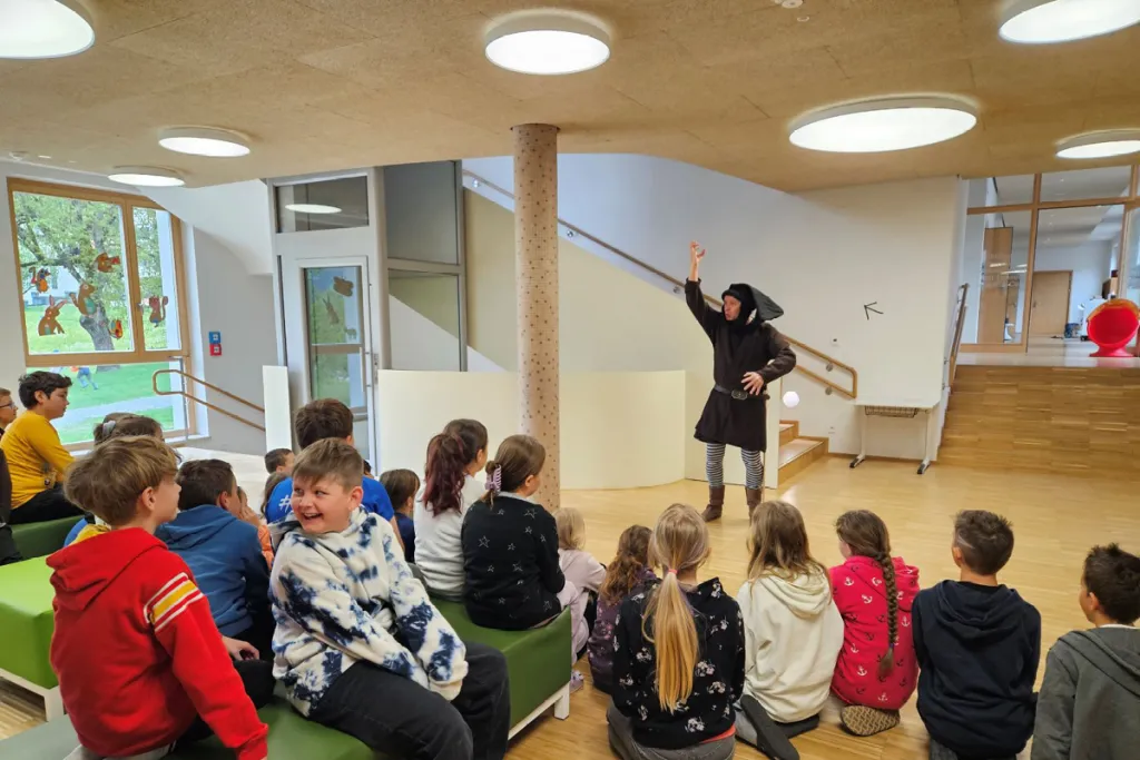 Das Märchen-Theater „Ritter Knuzius" begeistert die Kinder in der VS Tschagguns mit lebendigen Rittergeschichten.