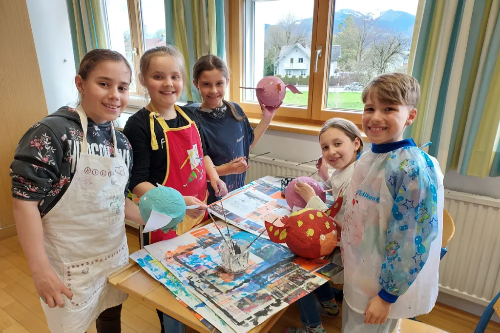 Für den Tag der offenen Tür am 6. Mai gestalten die Schüler:innen der 4a Klasse und 4b Klasse Vögel und Figuren aus Luftballons und Pappmaschee. Unter der Anleitung der Künstlerin May-Britt Chromy entstehen einzigartige bunte Tiere und Figuren. Alle sind mit viel Motivation und Freude dabei und freuen sich darauf, ihre Kunstwerke präsentieren zu können. Die gestalteten Objekte dienen als wunderschöne Ausstellungsstücke in den neuen Räumlichkeiten der Schule. Die Viertklässler beteiligen sich mit großem Eifer an diesem Projekt und die Rückmeldung der Besucher:innen ist durchwegs positiv.
