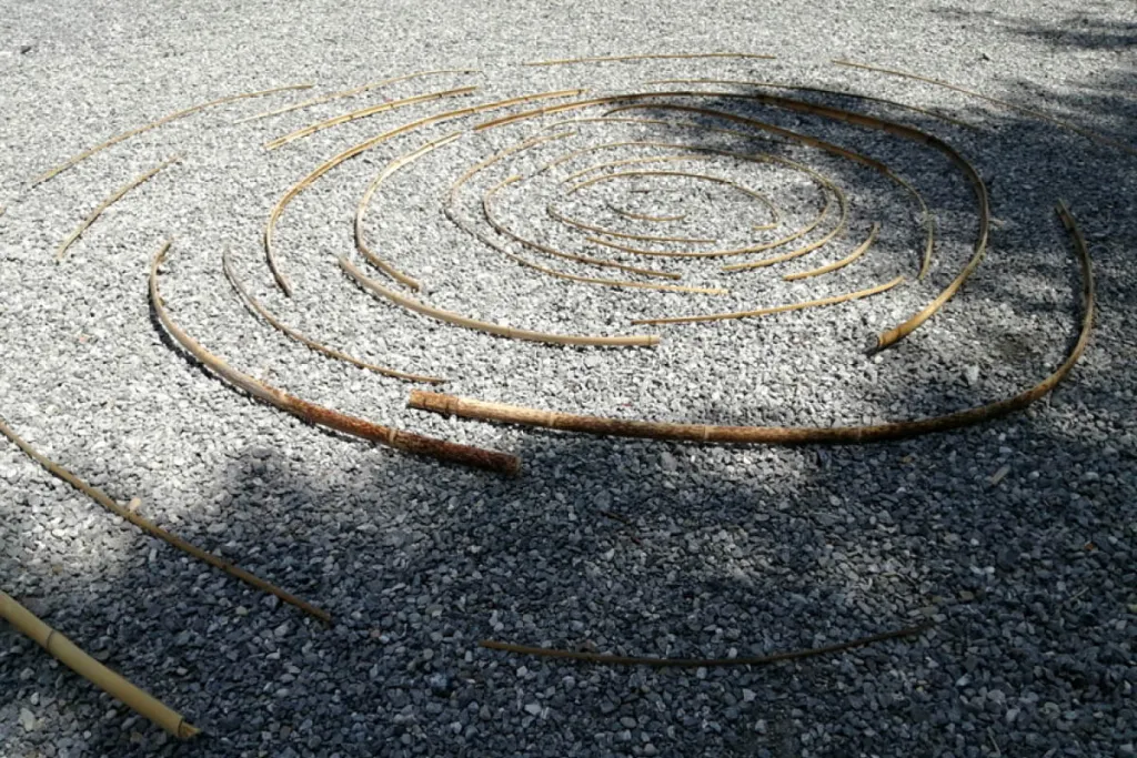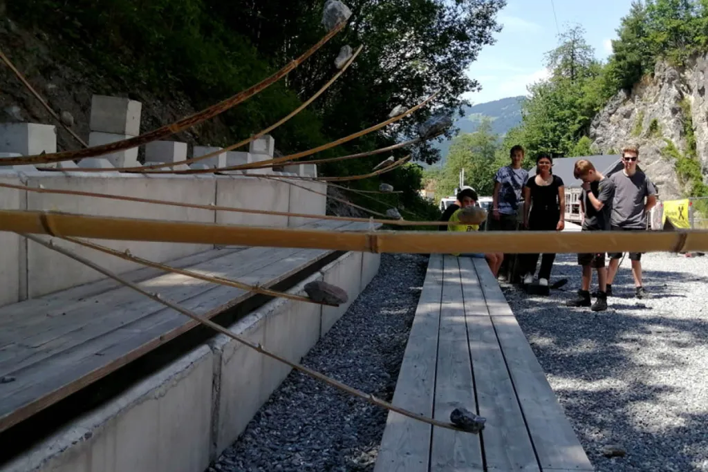 Weiters werden Arbeiten mit vorgefundenem Bambusrohr erstellt. Dabei wird auf die Materialeigenschaften des Baumaterials Bambusrohr sowie auf das Gelände Bezug genommen. Als Aufgabenstellung bekommen die Schüler:innen sollen sie linear angeordnete Einzelarbeiten bestehend aus einem halbierten Bambusrohr und einem einzelnen Stein erstellen. Diese ergeben eine Gesamtskulptur, die durch das Einwirken des Windes Bewegungen geniert und dadurch in ihrer Erscheinung sehr poetisch auf uns wirkt. Um die Spannung zu potenzieren, werden die Kinder dazu angehalten, aufs Ganze zu gehen, das heißt, einen möglichst schweren Stein zu wählen, der vom Bambusrohr gerade noch getragen werden kann, ohne ein Knicken des Rohres hervorzurufen. Das Schwanken der Bambusstäbe im Wind wird dadurch auch verstärkt. Sie haben das Glück, dass die Windprise immer stärker wird und wir aus sicherer Entfernung beobachten können, wie die Steine aus der Balance geraten und nach und nach zu Boden fallen.