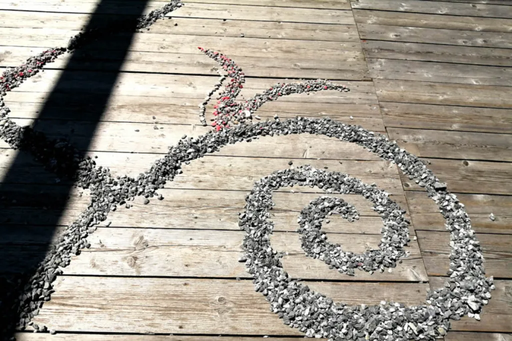 Im nächsten Schritt wird eine Gemeinschaftsinstallation auf dem Holzboden des Kulturstegs unter dem Motto "Gestaltung eines Bühnenbildes für eine Theaterszene: im Wildfluss Lutz" geschaffen. Darstellung von Wasser, Wellen und Strudeln durch das Auflegen von gesammelten Steinen. Aus gestalterischen Gründen werden dabei verschiedene Korngrößen verwendet. Aufgrund alter Bodenmarkierungen für die Bauarbeiten im Steinbruch kommen auch bunte Steine zum Einsatz.