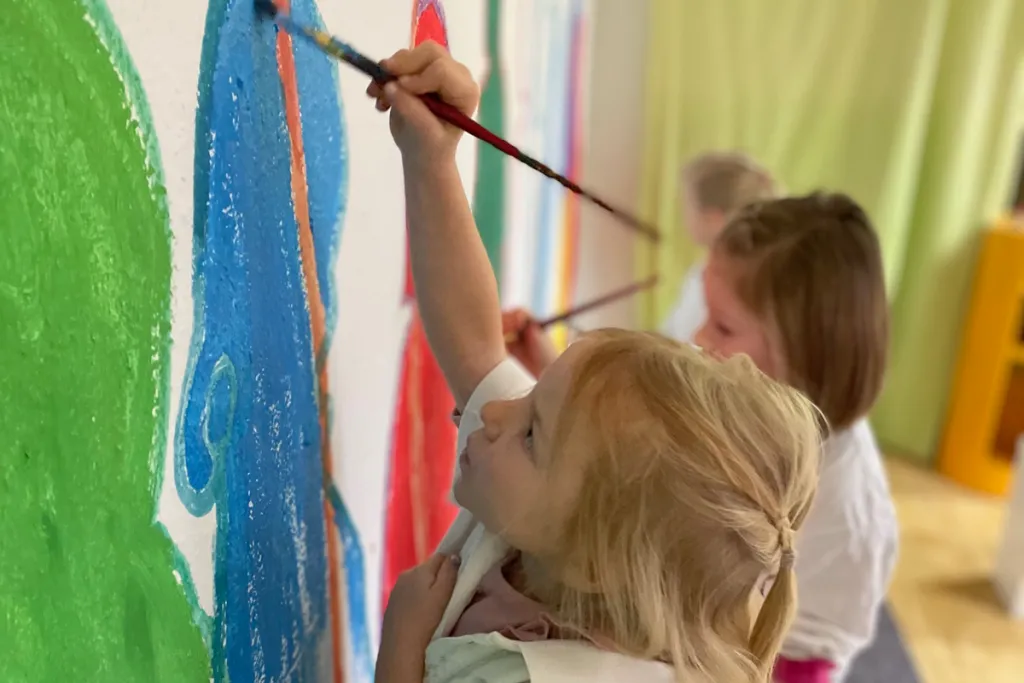 Die Kinderstube Höchst gestaltet bei einem Projekt mit Christa Bohle Entwürfe für die Gestaltung der Wand im Gruppenraum und lernen dabei Künstler:innen, deren Kunstwerke und Techniken kennen.
