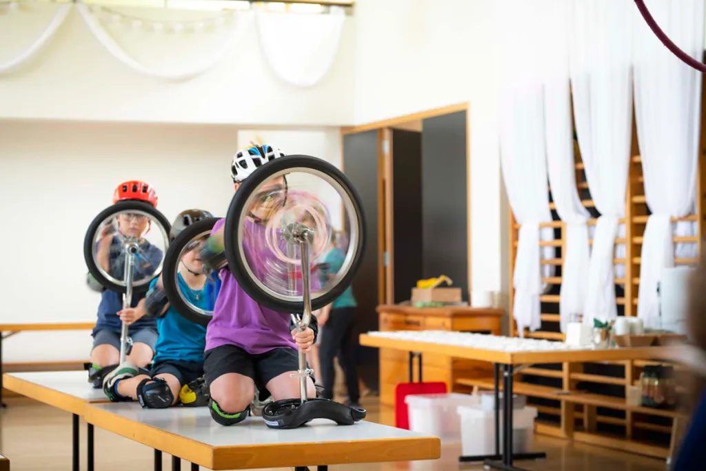 Jede Klasse beschäftigt sich an einem Vormittag mit verschiedenen Zirkusdisziplinen. Die Schüler:innen erhalten Einblicke in das Einradfahren, die Jonglage, Luftakrobatik, Bodenakrobatik sowie das Balancieren auf der Kugel. Anschließend entscheiden sich die Kinder für einen persönlichen Schwerpunkt und werden in drei Gruppen eingeteilt: Einrad & Jonglage, Luftakrobatik sowie Akrobatik & Kugel. In diesen Gruppen üben die Teilnehmer:innen die jeweiligen Kunststücke intensiv ein.
