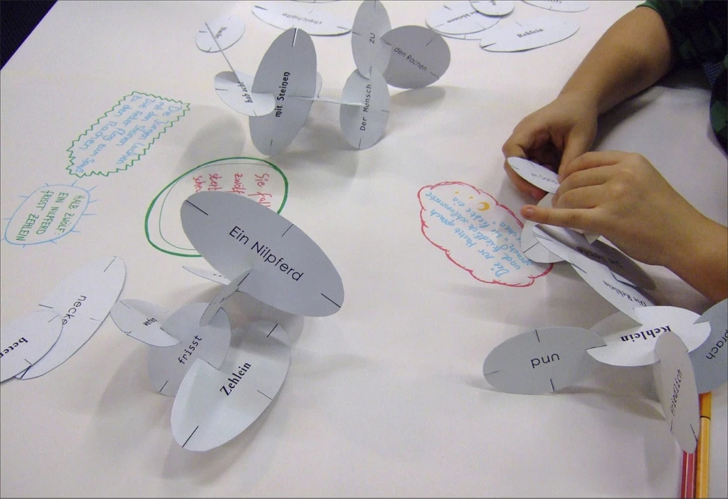 Die Schüler:innen stecken beliebig viele Module zu kleinen Poesiewolken zusammen, betrachten diese von allen Seiten und schreiben die Zeilen, die sie aus ihrer Wolke herauslesen, in Versen auf Papier. Es geht dabei nicht darum, die Ursprungsgedichte zu erkennen.